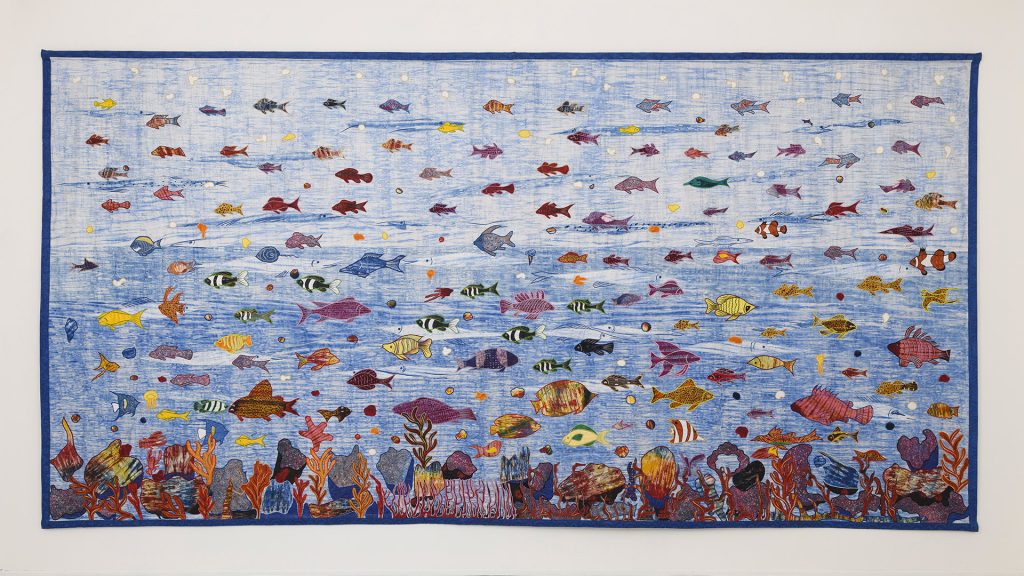 L’opera Ocean, mother and life di Abdoulaye Konaté, viene esplorata attraverso il tatto e l’udito: i bambini, bendati, toccano un tessuto ricamato in rilievo e ascoltano i suoni del mare. In laboratorio i mediatori guidano la classe a riflettere sul tema della salvaguardia dell’ambiente.