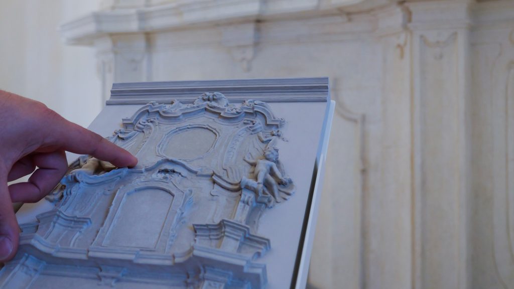 Insieme a una/o mediatrice/mediatore cieca/o i partecipanti esplorano l’architettura e il percorso tattile dedicato all’edificio settecentesco.